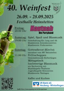 Ändere dein TitelbildHochladen Ändere dein TitelbildHochladen admin Dieser Benutzerkonto Status ist Freigegeben Über Über Beiträge Beiträge Kommentare Kommentare Rückblick Wagenfest vor 2 Wochen in: Beiträge Aktuelles keine Kommentare Dirndl- & Lederhosenparty am Weinfest-Freitag vor 2 Monaten in: Beiträge Aktuelles keine Kommentare Einladung zum Weinfest vor 2 Monaten in: Beiträge Aktuelles keine Kommentare Jugendmusiktage 2025 in Heinstetten vor 4 Monaten in: Beiträge Aktuelles keine Kommentare Deutsches Musikfest in Ulm vor 5 Monaten in: Beiträge Aktuelles keine Kommentare Altmetallsammlung 2025 vor 6 Monaten in: Beiträge Aktuelles keine Kommentare Herzliche Einladung zu den Jugendmusiktagen vor 6 Monaten in: Beiträge Aktuelles keine Kommentare Generalversammlung 2025 vor 7 Monaten in: Beiträge Aktuelles keine Kommentare Männertanzwettbewerb 2025 vor 10 Monaten in: Beiträge Aktuelles keine Kommentare Weihnachtskonzert 2024 – Rückblick vor 11 Monaten in: Beiträge Aktuelles keine Kommentare Weitere Beiträge laden